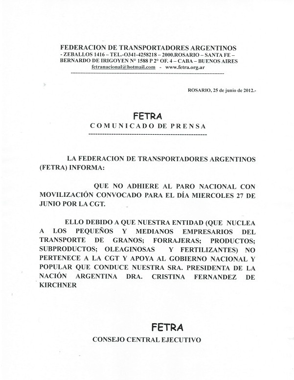 COMUNICADO DE PRENSA DE Fe.Tr.A