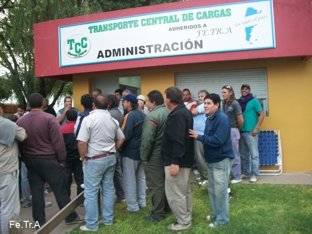 El Sr. Presidente de la Asociación de Transportistas (TCC) de Marcos Juarez Sr. Sergio Chenzón acompañado por los transportistas y autoridades de Fe.Tr.A (Sr. Claudi Enri Secretario Gremial y Dr. Martín Pardo).