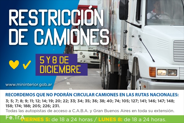 Se restringirá la circulación de camiones de más de 3.500 kg en las rutas nacionales y los accesos a C.A.B.A., en las siguientes fechas y horarios: