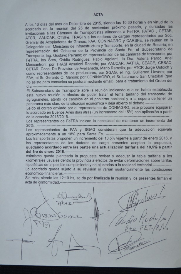 Acuerdo de aumento tarifario del 18,5 a partir del 1ro de Enero de 2016