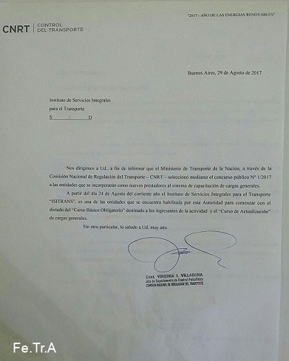 La Federación de Transportadores Argentinos (Fe.Tr.A) tiene el agrado de informarles a todos los transportistas de cargas generales que, de acuerdo al Concurso Público N° 1/2017 de la CNRT, su Fundación “Instituto de Servicios Integrales para el Transporte” (I.S.I.Trans) ha sido elegida por dicha Comisión Nacional como uno de los prestadores habilitados para el dictado de los cursos de: CAPACITACIÓN para Actualización/Renovación de cargas generales Licencia Nacional Habilitante (LNH) y el dictado del Curso Básico Obligatorio (CBO), a partir del 24 de agosto del corriente año.