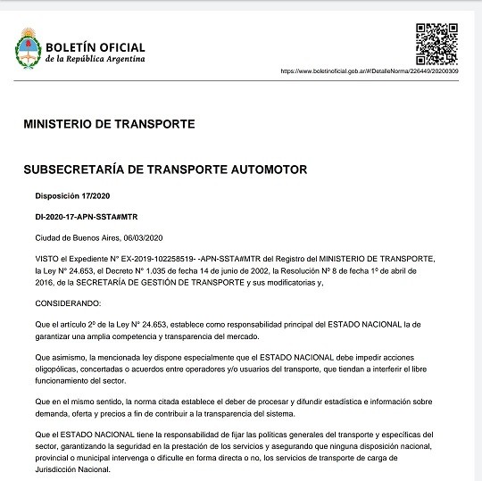 Comuníquese a la ADMINISTRACIÓN FEDERAL DE INGRESOS PÚBLICOS organismo autárquico actuante en el ámbito del MINISTERIO DE ECONOMÍA, al MINISTERIO DE AGRICULTURA, GANADERÍA Y PESCA, y a la COMISIÓN NACIONAL DE REGULACIÓN DEL TRANSPORTE, organismo autárquico actuante en jurisdicción del MINISTERIO DE TRANSPORTE. ARTÍCULO 3°.- Comuníquese, publíquese, dese a la DIRECCIÓN NACIONAL DEL REGISTRO OFICIAL y archívese. Gabriel Raúl Bermúdez NOTA: El/los Anexo/s que integra/n este(a) Disposición se publican en la edición web del BORA -www.boletinoficial.gob.are. 09/03/2020 N° 12798/20 v. 09/03/2020 Fecha de publicación 09/03/2020
