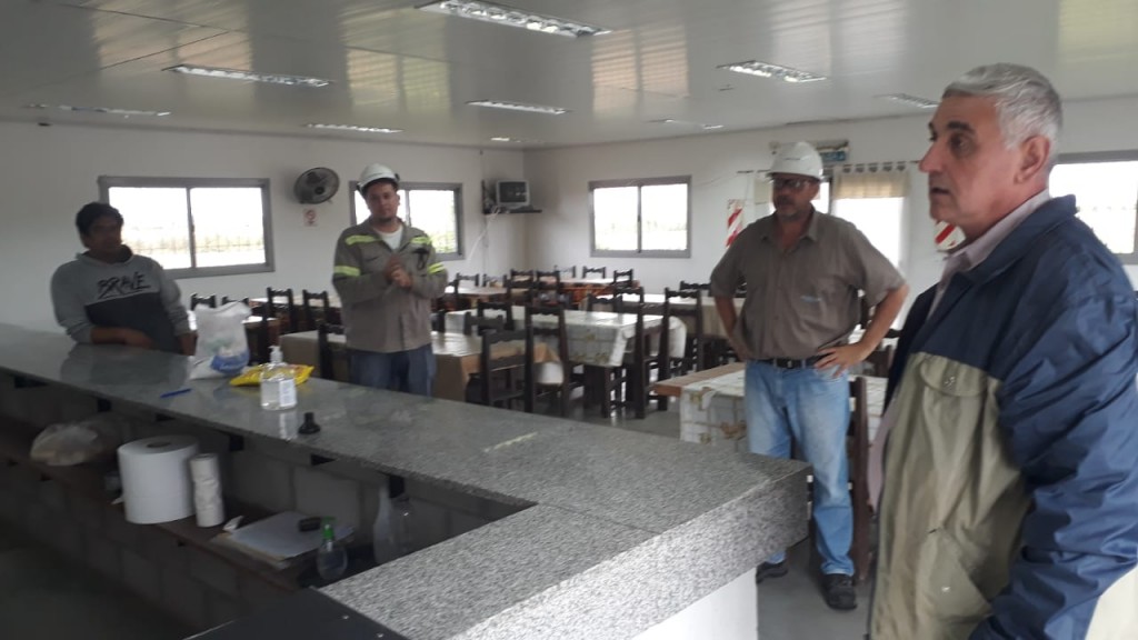 27 de Marzo del 2020. Claudio Enri, Secretario Gremial de la Federación, recorre la Playa, baños y comedor de LDC Timbúes comprobando el cumplimiento del protocolo en higiene de baños, comedor con provisión de viandas, separación de camiones, carteleria visible sobre prevención y cuidados para evitar el contagio del COVID-19, quedando pendiente la desinfección de las unidades.