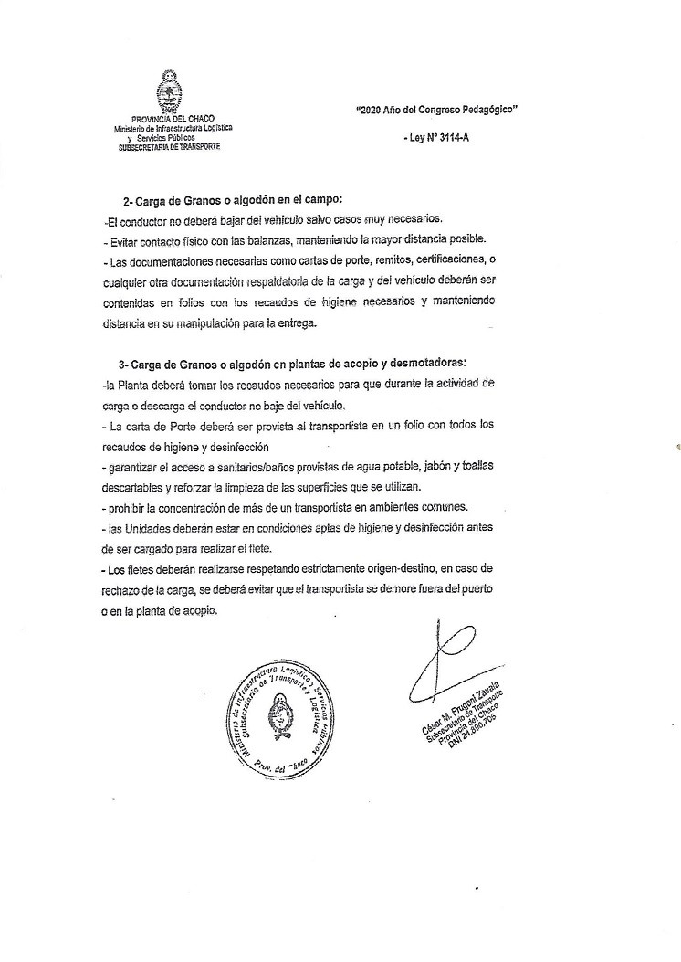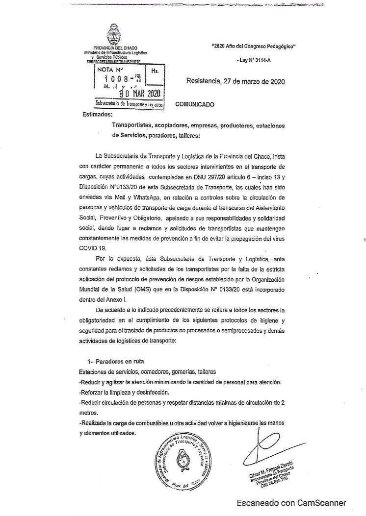 Comunicado de la Subsecretaría de Transporte del Chaco.