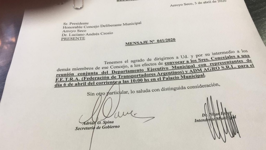 El Sr. Intendente de la Ciudad de Arroyo Seco convoca a los Srs. Concejales Fe.Tr.A y ADM Agro para el día 06 de Abril a las 10 hs en el palacio Municipal.