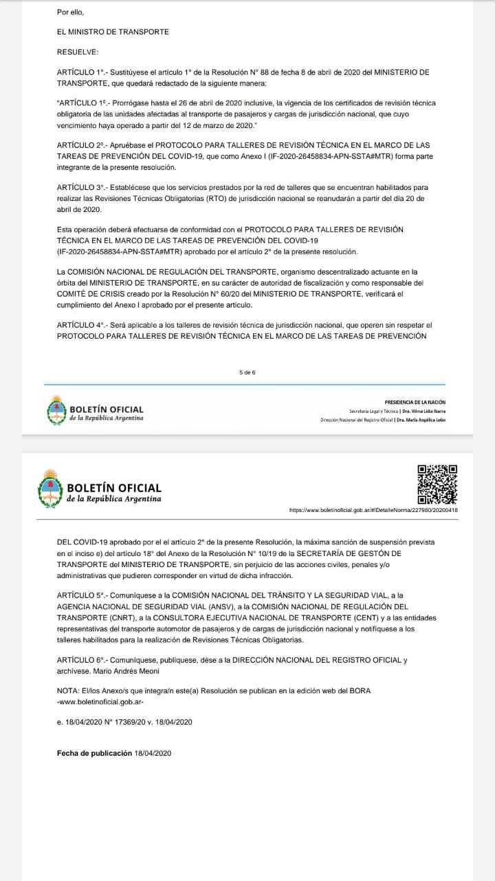 “ARTÍCULO 1º.- Prorrógase hasta el 26 de abril de 2020 inclusive, la vigencia de los certificados de revisión técnica