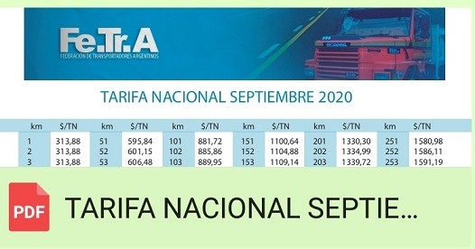 TARIFA NACIONAL PARA EL TRANSPORTE DE CEREALES Y OLEAGINOSAS SEPTIEMBRE 2020 CLIC PARA BAJAR TARIFA