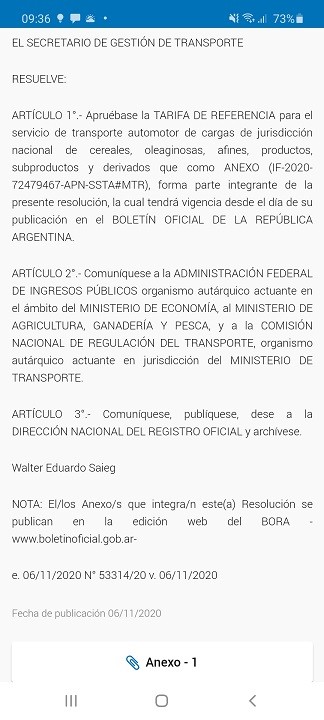 MINISTERIO DE TRANSPORTE SECRETARÍA DE GESTIÓN DE TRANSPORTE Resolución 58/2020 RESOL-2020-58-APN-SECGT#MTR Ciudad de Buenos Aires, 04/11/2020 VISTO el Expediente N° EX-2020-61152174- -APN-DGD#MTR, la Ley N° 24.653, el Decreto N° 1.035 de fecha 14 de junio de 2002, la Resolución Nº 8 de fecha 1º de abril de 2016, de la SECRETARÍA DE GESTIÓN DE TRANSPORTE y sus modificatorias y, CONSIDERANDO: Que el artículo 2º de la Ley N° 24.653, establece como responsabilidad principal del ESTADO NACIONAL la de garantizar una amplia competencia y transparencia del mercado. Que la mencionada ley dispone especialmente que el ESTADO NACIONAL debe impedir acciones oligopólicas, concertadas o acuerdos entre operadores y/o usuarios del transporte, que tiendan a interferir el libre funcionamiento del sector. Que en el mismo sentido, la norma citada establece el deber de procesar y difundir estadística e información sobre demanda, oferta y precios a fin de contribuir a la transparencia del sistema. Que el ESTADO NACIONAL tiene la responsabilidad de fijar las políticas generales del transporte y específicas del sector, velando por la seguridad en la prestación de los servicios y por que ninguna disposición nacional, provincial o municipal intervenga o dificulte en forma directa o no, los servicios de transporte de carga de Jurisdicción Nacional. Que a través del artículo 5° de la Ley N° 24.653, se facultó a la entonces SECRETARÍA DE TRANSPORTE, en su carácter de Autoridad de Aplicación, a coordinar las relaciones entre el poder público y los sectores interesados, como así también a requerir y promover la participación de las entidades empresarias y sindicales en la propuesta y desarrollo de políticas y acciones atinentes al sector. Que por otra parte, el Decreto N° 1.035 de fecha 14 de junio de 2002, aprueba por su artículo 1° la reglamentación de la Ley Nº 24.653, estableciendo en el Capítulo II del Anexo I, denominado “POLÍTICAS DEL TRANSPORTE DE CARGAS”, que la elaboración e implementación de las políticas en materia de transporte de cargas de Jurisdicción Nacional, tendrá como uno de sus especiales objetivos, la participación de las entidades representativas del sector empresario y sindical a los fines de considerar sus opiniones y recomendaciones, en la toma de decisiones referentes al sector. Que en consecuencia, se dictó la Resolución Nº 8 de fecha 1º de abril de 2016 de la SECRETARÍA DE GESTIÓN DE TRANSPORTE del MINISTERIO DE TRANSPORTE, mediante la cual se creó la MESA DE NEGOCIACIÓN PARTICIPATIVA, como mecanismo para la determinación de la TARIFA DE REFERENCIA para el servicio del transporte automotor de cargas de Jurisdicción Nacional de cereales, oleaginosas, afines, productos, subproductos y derivados, la cual se encuentra integrada por las cámaras empresarias representativas del transporte automotor de cargas y las entidades representativas del sector empresarial de producción agraria, así como también por representantes del ex MINISTERIO DE AGROINDUSTRIA y de la SUBSECRETARÍA DE TRANSPORTE AUTOMOTOR, con el objetivo de evitar la competencia desleal entre las empresas transportistas del sector. Que posteriormente mediante Resolución N° 190 de fecha 3 de diciembre de 2018 de la SECRETARÍA DE GESTIÓN DE TRANSPORTE se delegó en la SUBSECRETARÍA DE TRANSPORTE AUTOMOTOR la facultad para modificar el procedimiento de convocatoria y funcionamiento de la Mesa de Negociación Participativa, aprobado por el Anexo II de la Resolución Nº 8/2016 de la SECRETARÍA DE GESTIÓN DE TRANSPORTE. Que conforme a ello, la SUBSECRETARÍA DE TRANSPORTE AUTOMOTOR dictó la Disposición Nº 1 de fecha 1 de febrero de 2019 que sustituyó el ANEXO II de la Resolución Nº 8/16 de la SECRETARÍA DE GESTIÓN DE TRANSPORTE por el texto que informa su ANEXO I, modificando el procedimiento de convocatorias para la MESA DE NEGOCIACIÓN PARTICIPATIVA que determina la TARIFA DE REFERENCIA dándole mayor flexibilidad, ante incrementos de costos que inciden gravemente sobre la actividad de transporte automotor de cargas de cereales, oleaginosas, afines, productos, subproductos y derivados. Que en este contexto la SUBSECRETARÍA DE TRANSPORTE AUTOMOTOR convocó para el 30 de septiembre de 2020 la reunión de la MESA DE NEGOCIACIÓN PARTICIPATIVA, a fin de proceder a la actualización de la TARIFA DE REFERENCIA atento los incrementos suscitados en los rubros que afectan las variables más significativas del transporte automotor de cargas, ratificándose el acta que da cuenta que las partes involucradas han arribado a un acuerdo sobre el valor de la variación de la TARIFA DE REFERENCIA. Que debido a las medidas sanitarias dispuestas por la Autoridad Sanitaria Nacional vigentes al momento de la celebración de la misma, particularmente el aislamiento social, preventivo y obligatorio, en cuya virtud se prohíbe la reunión de personas en espacios cerrados a fin de evitar la propagación del COVID-19, la SUBSECRETARÍA DE TRNASPORTE AUTOMOTOR ha considerado oportuno realizar la convocatoria a la MESA DE NEGOCIACIÓN PARTICIPATIVA bajo la modalidad virtual, mediante el uso da la plataforma Microsoft TEAMS del MINISTERIO DE TRANSPORTE provista para tal efecto. Que las partes participantes de la MESA DE NEGOCIACIÓN PARTICIPATIVA han acordado establecer un incremento de la TARIFA DE REFERENCIA para el servicio del transporte automotor de cargas de Jurisdicción Nacional de cereales, oleaginosas, afines, productos, subproductos y derivados, equivalente a un DIECINUEVE COMA CINCO POR CIENTO (19,5%) para el periodo comprendido entre los meses de enero y septiembre de 2020. Que la DIRECCIÓN NACIONAL DE TRANSPORTE AUTOMOTOR DE CARGAS, de la SUBSECRETARÍA DE TRANSPORTE AUTOMOTOR mediante estudio técnico efectuado en el marco y con los alcances de las competencias que le asisten, estimó que correspondería aplicar la variación del DIECINUEVE COMA CINCO POR CIENTO (19.5%)