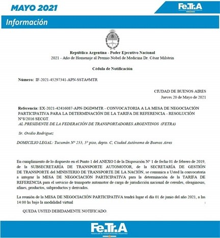 Por pedido de la Federación de Transportadores Argentinos (Fe.Tr.A) se concedió la mesa de negociación participativa para proceder a la actualización de la Tarifa Nacional, el día 01 de Junio.