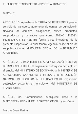La Tarifa Nacional de Cereales, ya esta en el Boletín Oficial.