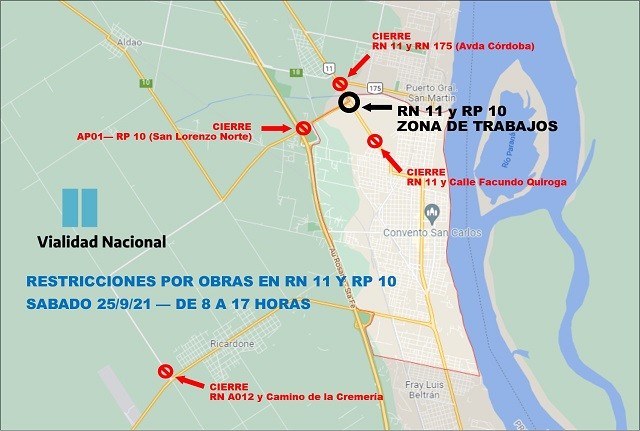 El día sábado 25 vialidad nacional realizará obras de bacheo en el cruce de RN 11 y RP 10 San Lorenzo, entre las 8 hs y las 17 hs, procediendo al corte total de la circulación, que tendrá desvíos por Autopista Rosario - Santa Fe para el transito pesado.