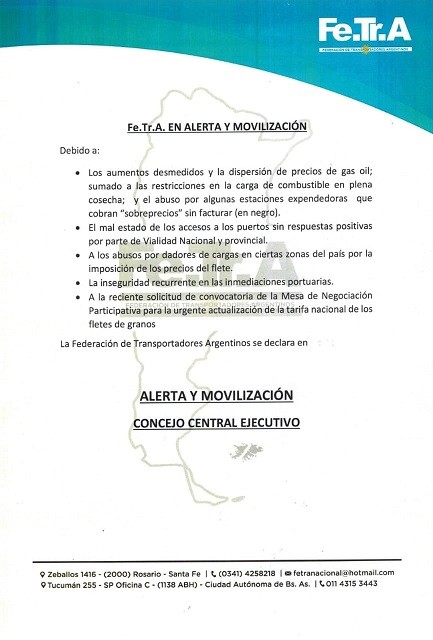 Fe.Tr.A EN ALERTA Y MOVILIZACIÓN