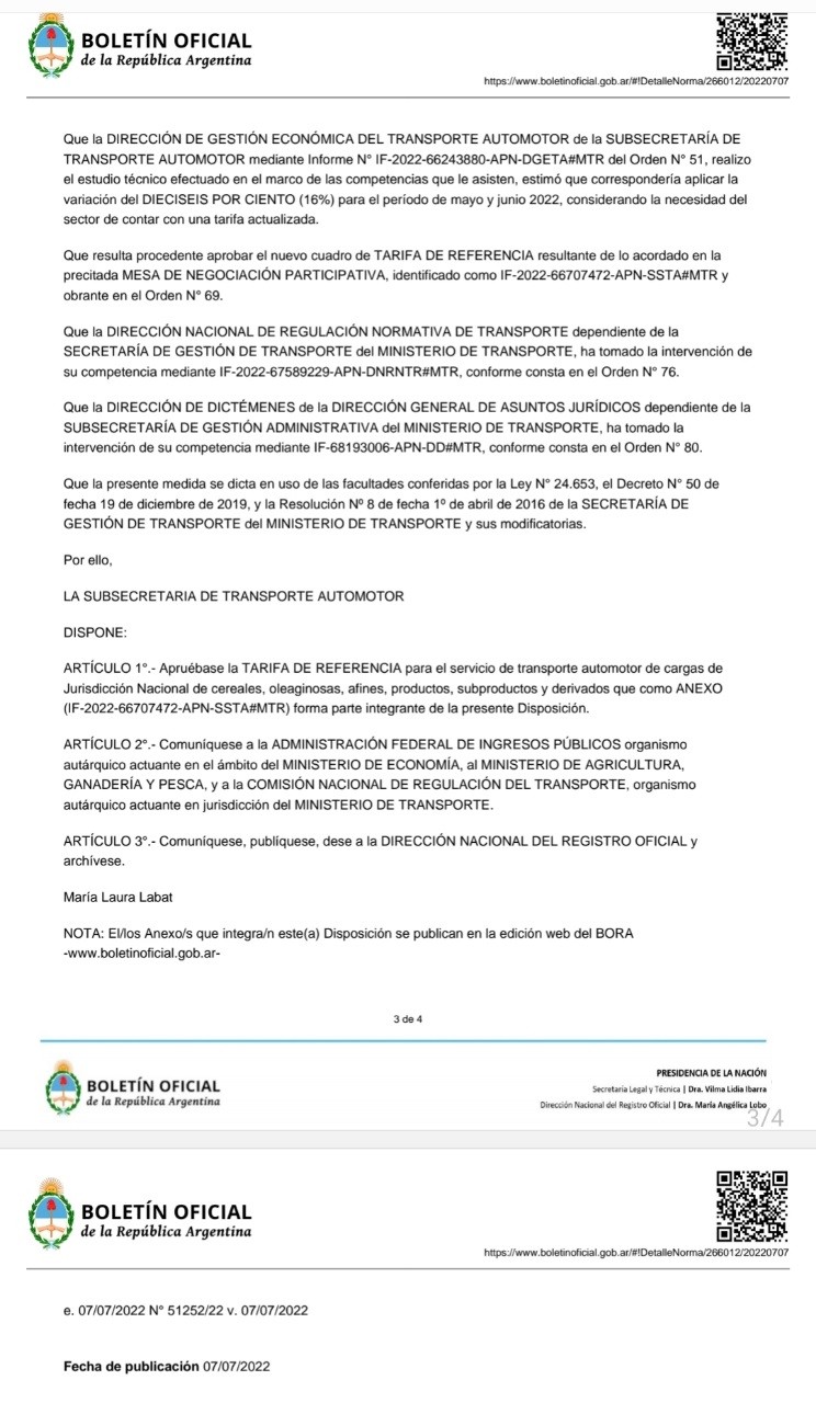 TARIFA NACIONAL PARA CEREALES Y OLEAGINOSAS ACTUALIZADA, FeTrA informa que ya fue publicada en el Boletín Oficial.
